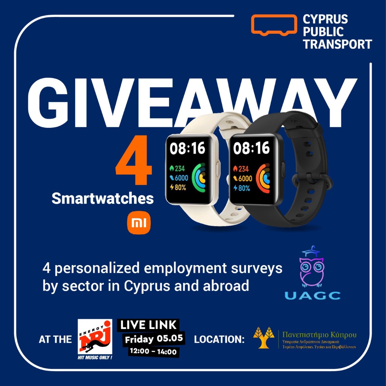 Ελάτε να ενημερωθείτε για τις διαδρομές, να βγάλετε και να ανεβάσετε στο Instagram ομαδική φωτογραφία με το UNIBUS, και να λάβετε μέρος στο διαγωνισμό με κλήρωση 4ων ρολογιών Smartwatch της XIAOMI & για 4ις εξατομικευμένες έρευνες ανά τομέα εργοδότησης σε Κύπρο και εξωτερικό από την Universal Admission Gate Cyprus.